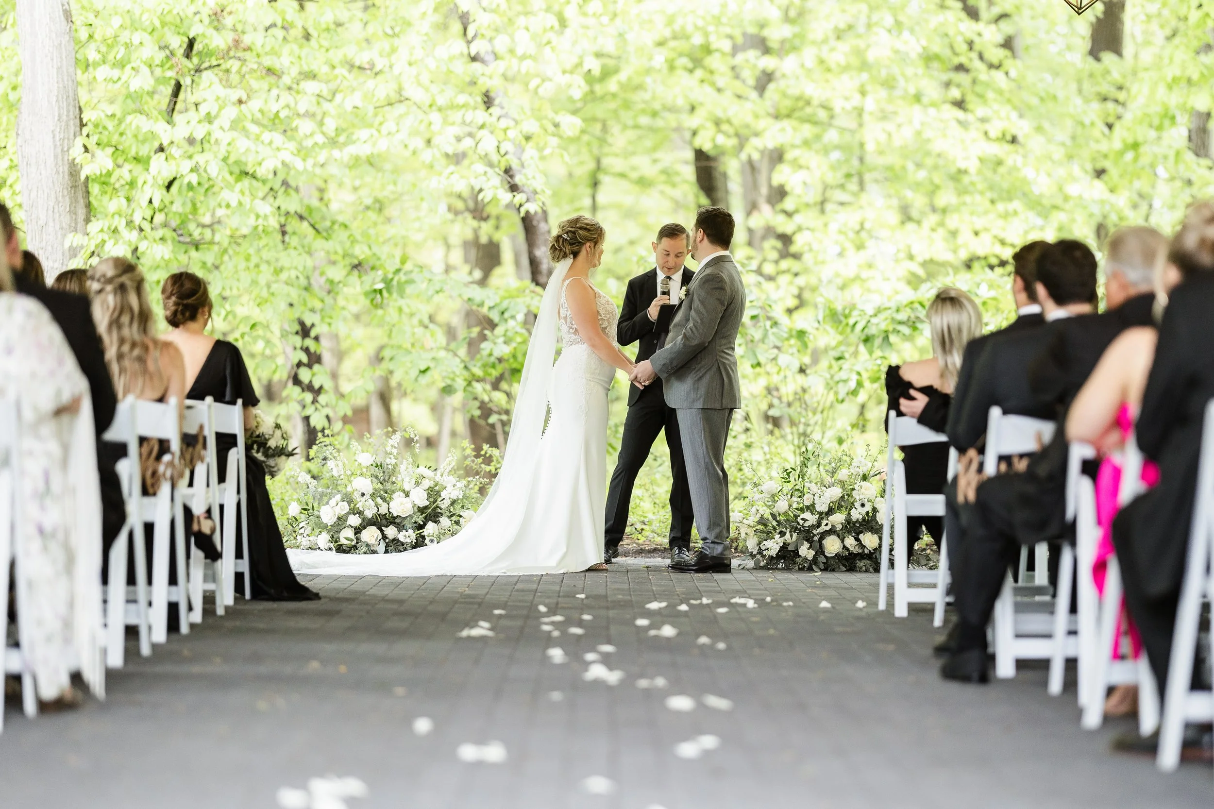 Surrounded by lush trees, gardens, and nearby fields that blend the ceremony with the landscape.