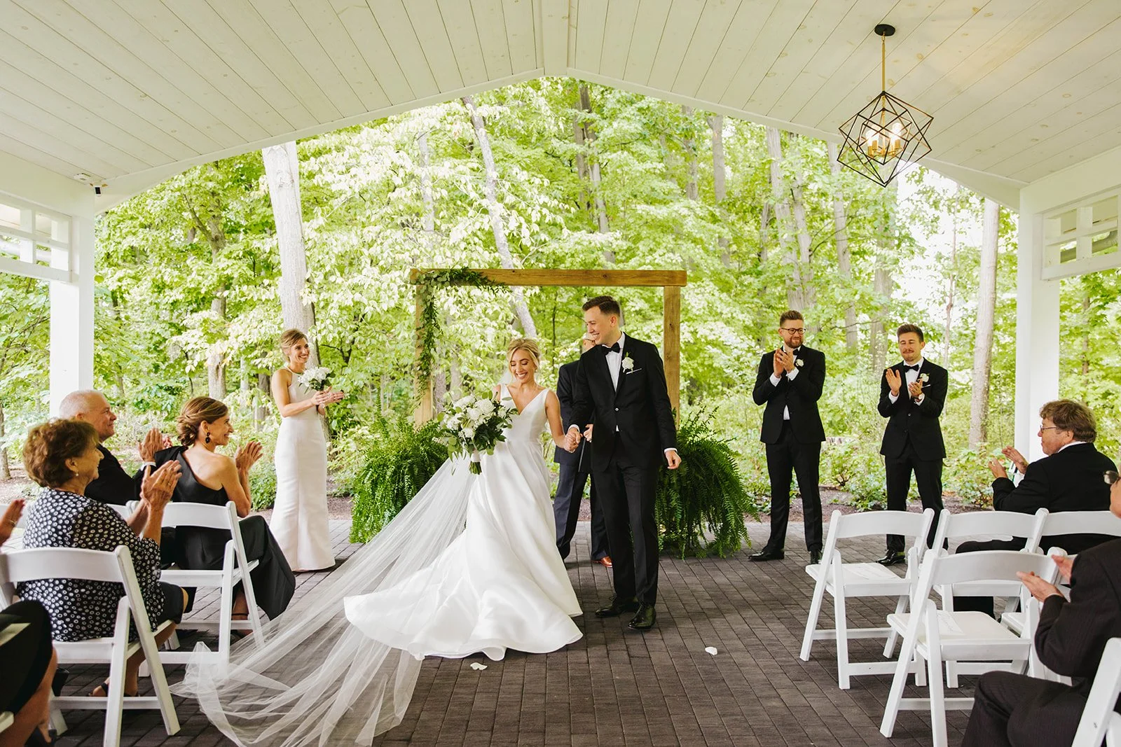 Crisp white ceiling and clean architectural lines provide an elegant backdrop for ceremonies.